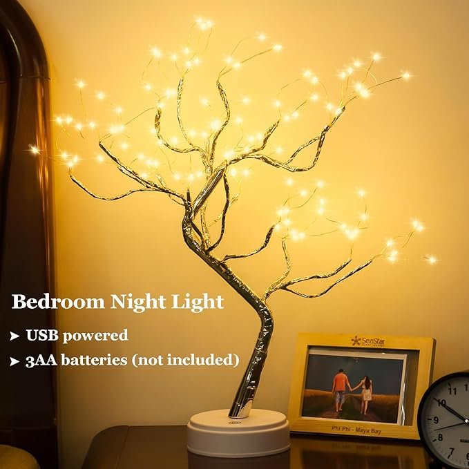 - ➤【High-quality LED Tree Lamp】 LED tree lamp are composed of 108 LED copper wire string lights, touch sensor switches, ABS bases, and artificial branches. Operated by USB or 3 AA batteries, LED bulbs will not generate heat for a long time, safe and energy saving and save money. This LED tree light is a necessary decorative night light for your bedroom.